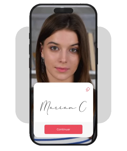 Video de 47 segundos mostrando al firmante trazando su firma. Biometría facial. Audio: “Yo, [nombre], acepto firmar este pagaré…” Sello de tiempo: 14 de marzo, 16:42:33.